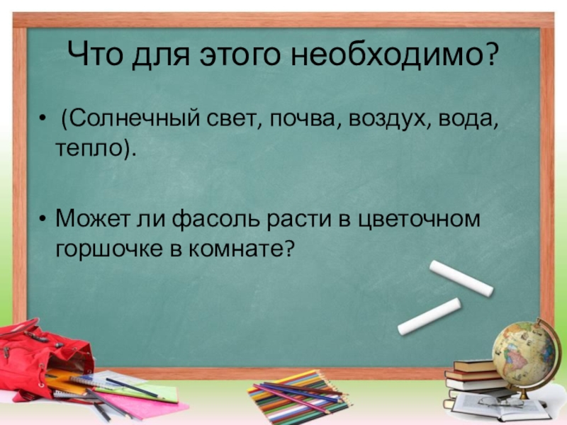 Что для этого необходимо? (Солнечный свет, почва, воздух, вода, тепло). Может ли фасоль расти в цветочном горшочке
