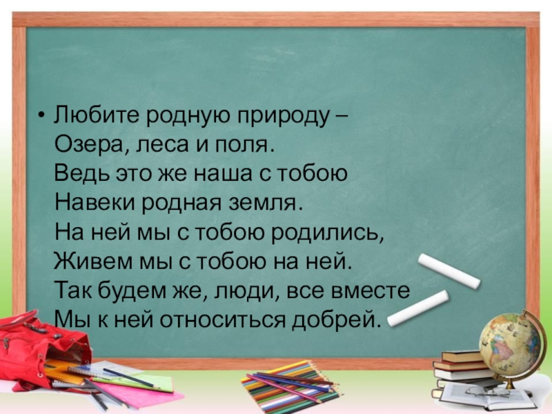 Любите родную природу – Озера, леса и поля. Ведь это же наша с тобою Навеки родная земля. На ней мы с тобою родились, Живем мы с тобою на ней. Так будем же, люди, все вместе Мы