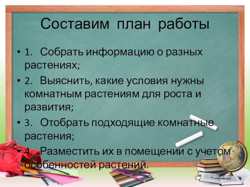 Составим план работы1.	Собрать информацию о разных растениях;2.	Выяснить, какие условия нужны комнатным растениям для роста и развития;3.	Отобрать подходящие