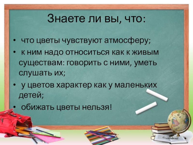 Знаете ли вы, что: 	что цветы чувствуют атмосферу;	к ним надо относиться как к живым существам: говорить