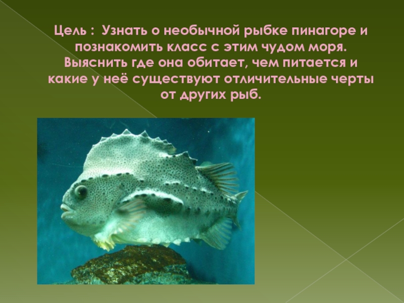 Цель : Узнать о необычной рыбке пинагоре и познакомить класс с этим чудом моря. Выяснить где она обитает, чем питается и какие у неё существуют отличительные черты от других рыб.