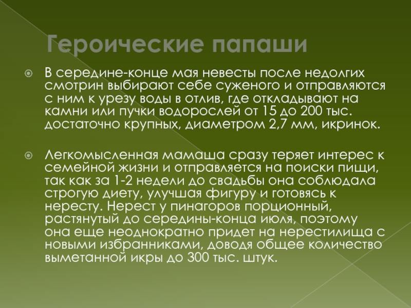 Героические папашиВ середине-конце мая невесты после недолгих смотрин выбирают себе суженого и отправляются с ним к урезу