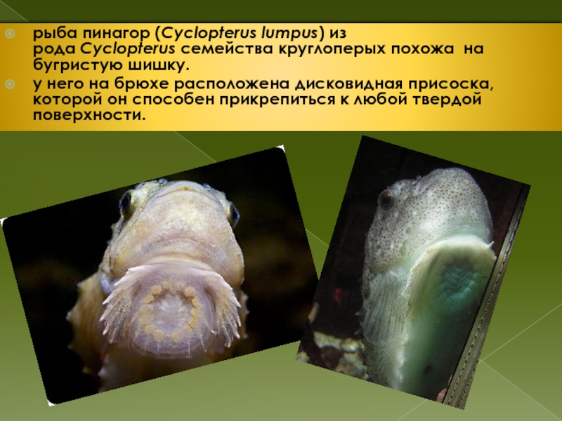 Слайд 5рыба пинагор (Cyclopterus lumpus) из рода Cyclopterus семейства круглоперых похожа на бугристую шишку.