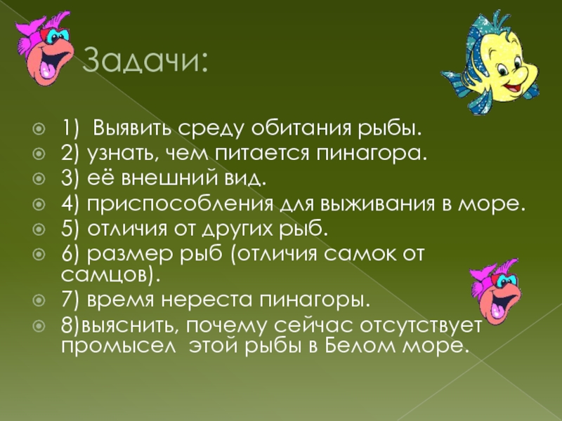 Задачи:1) Выявить среду обитания рыбы.2) узнать, чем питается пинагора.3) её внешний вид.4) приспособления для выживания в