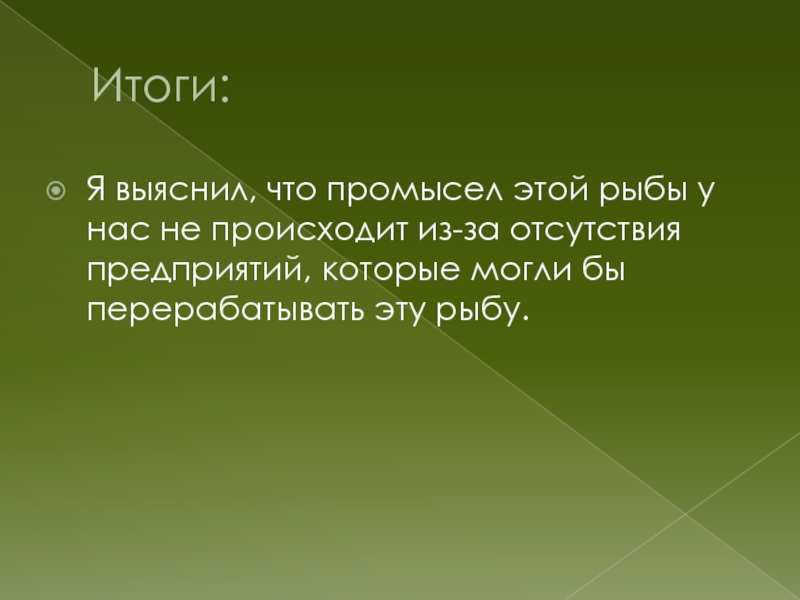 Итоги:Я выяснил, что промысел этой рыбы у нас не происходит из-за отсутствия предприятий, которые могли бы перерабатывать