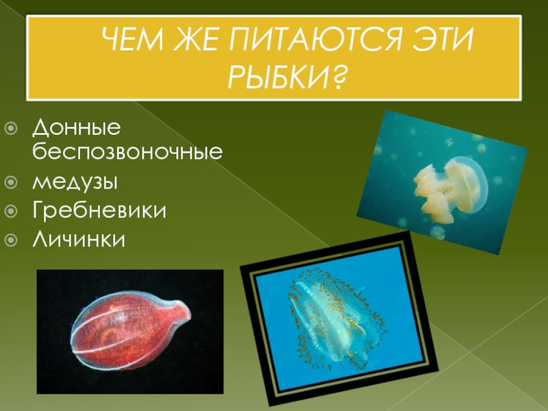 ЧЕМ ЖЕ ПИТАЮТСЯ ЭТИ РЫБКИ?Донные беспозвоночныемедузы ГребневикиЛичинки
