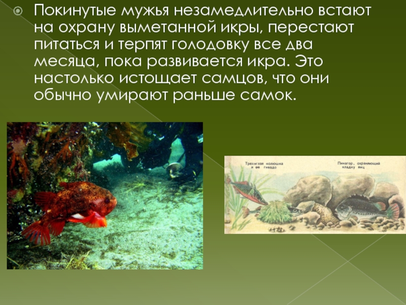Слайд 12Покинутые мужья незамедлительно встают на охрану выметанной икры, перестают питаться и