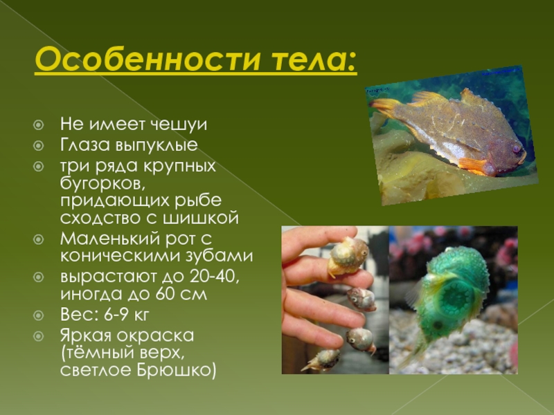 Особенности тела:Не имеет чешуиГлаза выпуклые три ряда крупных бугорков, придающих рыбе сходство с шишкойМаленький рот с коническими
