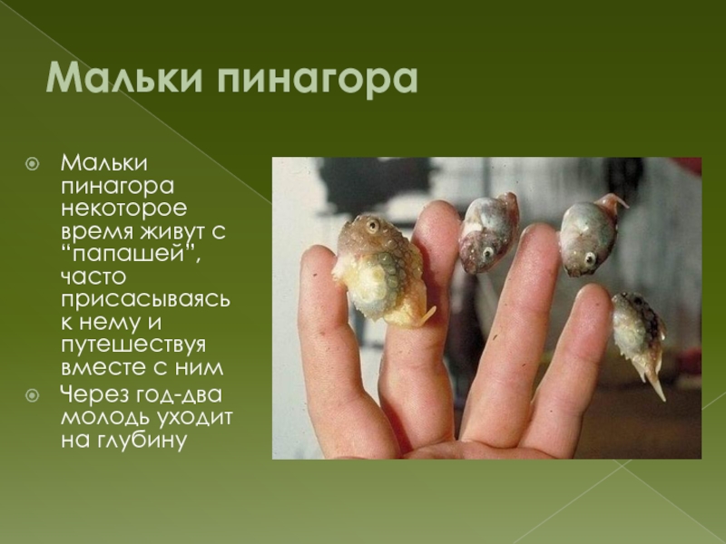 Мальки пинагораМальки пинагора некоторое время живут с “папашей”, часто присасываясь к нему и путешествуя вместе с нимЧерез