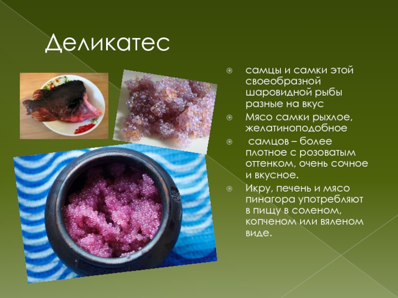 Деликатессамцы и самки этой своеобразной шаровидной рыбы разные на вкусМясо самки рыхлое, желатиноподобное самцов – более плотное