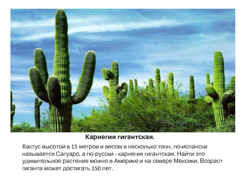 тонн, по-испански называется Сагуаро, а по-русски - карнегия гигантская. Найти это удивительное растение можно в Америке и на севере Мексики. Возраст гиганта может достигать 150 лет.