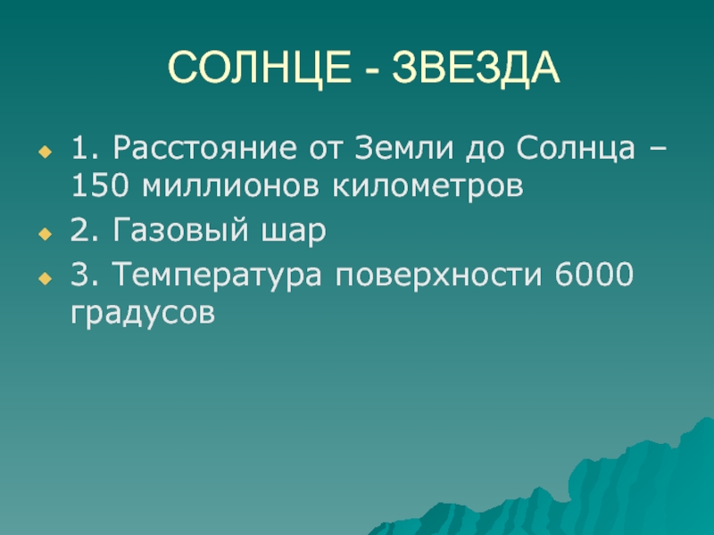 СОЛНЦЕ - ЗВЕЗДА1. Расстояние от Земли до Солнца – 150 миллионов километров2. Газовый шар3. Температура поверхности 6000