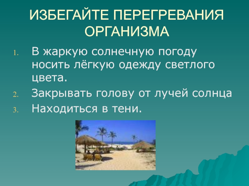 ИЗБЕГАЙТЕ ПЕРЕГРЕВАНИЯ ОРГАНИЗМАВ жаркую солнечную погоду носить лёгкую одежду светлого цвета.Закрывать голову от лучей солнцаНаходиться в тени.