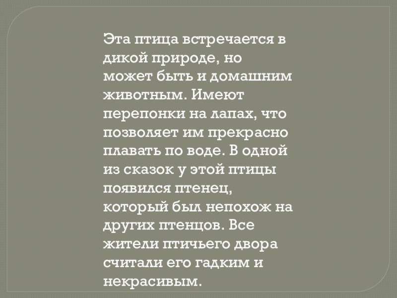 животным. Имеют перепонки на лапах, что позволяет им прекрасно плавать по воде. В одной из сказок у этой птицы появился птенец, который был непохож на других птенцов. Все жители птичьего двора считали его гадким и некрасивым.