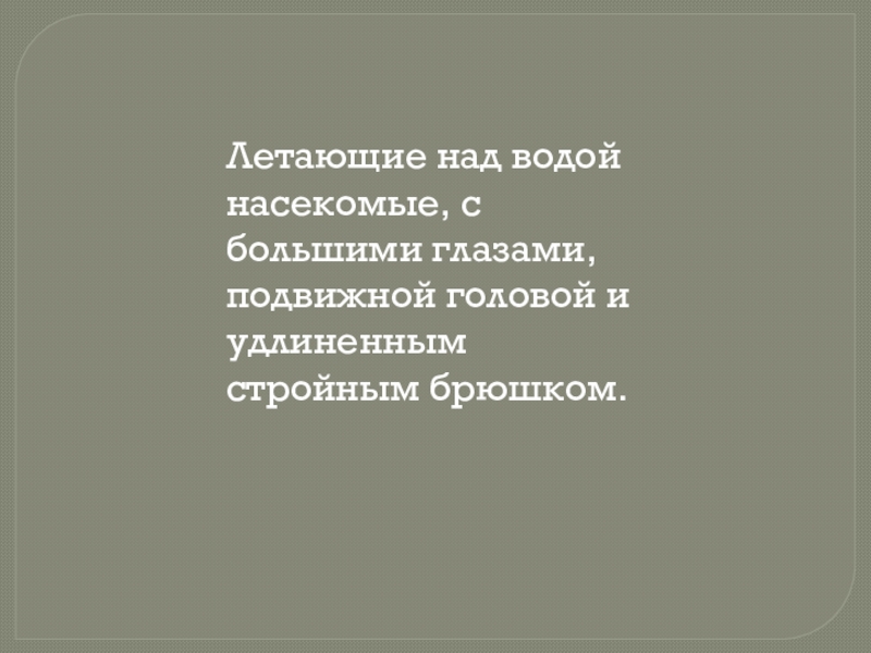 Летающие над водой насекомые, с большими глазами, подвижной головой и удлиненным стройным брюшком.