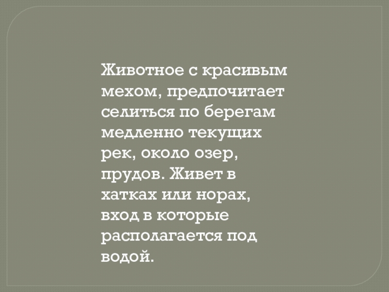 Слайд 2Животное с красивым мехом, предпочитает селиться по берегам медленно текущих рек,