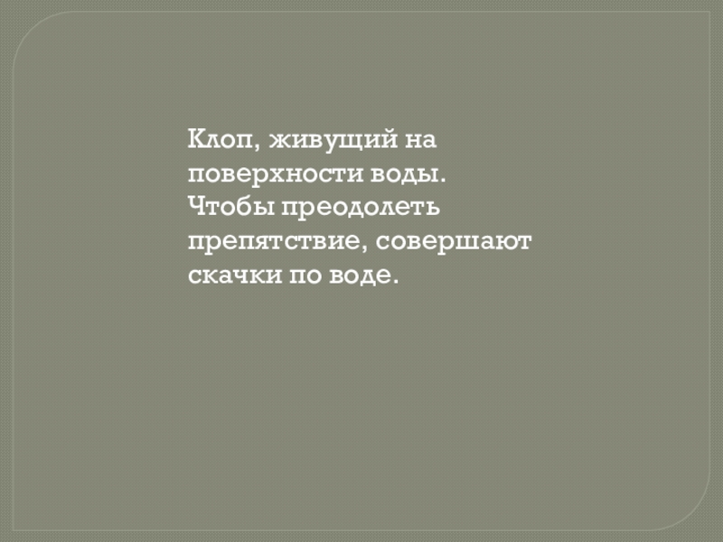 Слайд 8Клоп, живущий на поверхности воды. Чтобы преодолеть препятствие, совершают скачки по