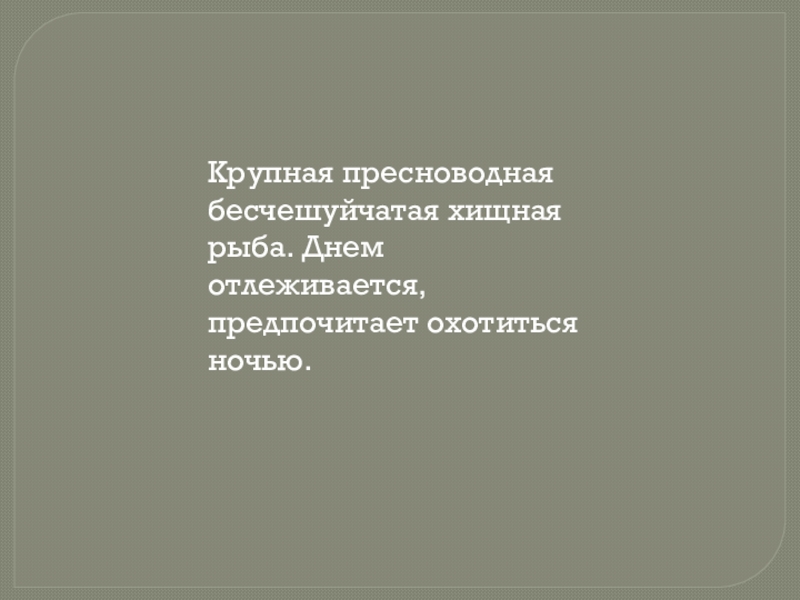 Слайд 10Крупная пресноводная бесчешуйчатая хищная рыба. Днем отлеживается, предпочитает охотиться ночью.