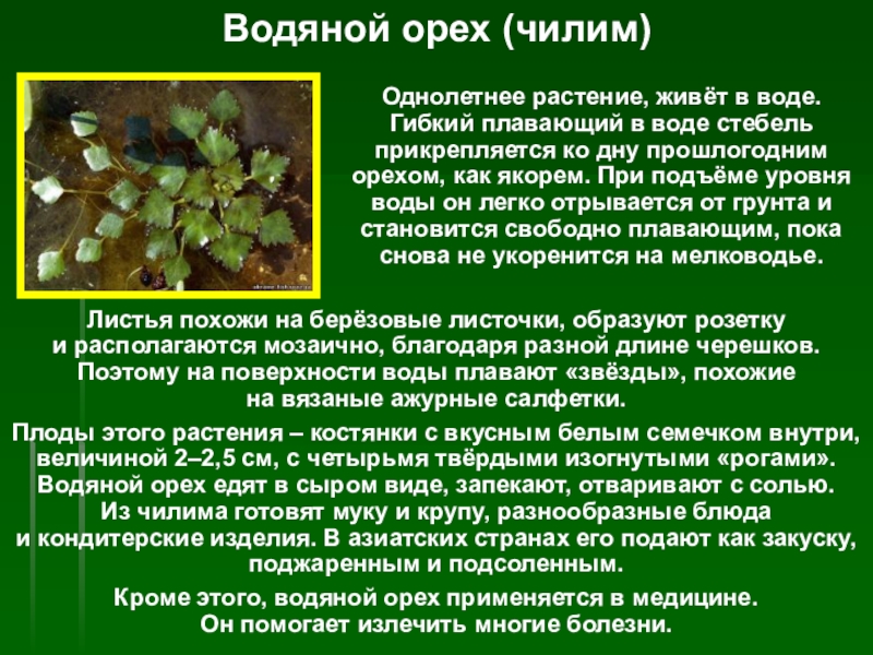 Плоды этого растения – костянки с вкусным белым семечком внутри, величиной 2–2,5 см, с четырьмя твёрдыми изогнутыми «рогами». Водяной орех едят в сыром виде, запекают, отваривают с солью.