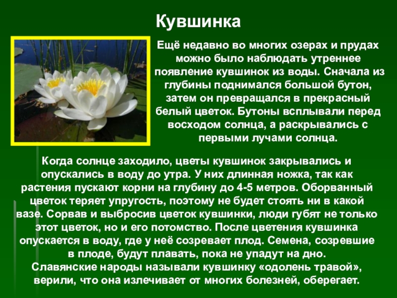 Когда солнце заходило, цветы кувшинок закрывались и опускались в воду до утра. У них длинная ножка, так как растения пускают корни на глубину до 4-5 метров. Оборванный цветок теряет упругость, поэтому не будет стоять ни в какой вазе. Сорвав и выбросив цветок кувшинки, люди губят не только этот цветок, но и его потомство. После цветения кувшинка опускается в воду, где у неё созревает плод. Семена, созревшие в плоде, будут плавать, пока не упадут на дно.