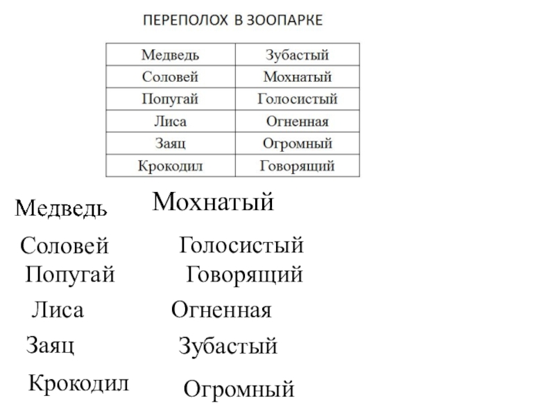 Мохнатый Соловей ГолосистыйПопугай ГоворящийЛиса Огненная Заяц ЗубастыйКрокодил Огромный