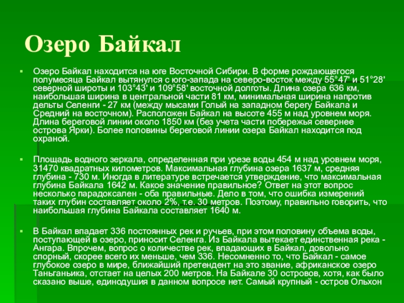 В Байкал впадает 336 постоянных рек и ручьев, при этом половину объема воды, поступающей в озеро, приносит Селенга. Из Байкала вытекает единственная река - Ангара. Впрочем, вопрос о количестве рек, впадающих в Байкал, довольно спорный, скорее всего их меньше, чем 336. Несомненно то, что Байкал - самое глубокое озеро в мире, ближайший претендент на это звание, африканское озеро Таньганьика, отстает на целых 200 метров. На Байкале 30 островов, хотя, как было сказано выше, единодушия в данном вопросе нет. Самый крупный - остров Ольхон