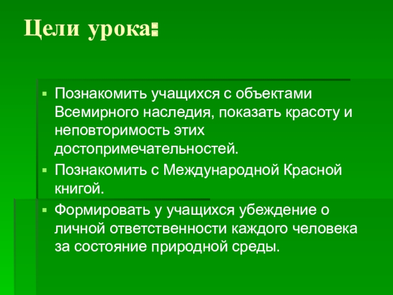 Познакомить учащихся с объектами Всемирного наследия, показать красоту и неповторимость