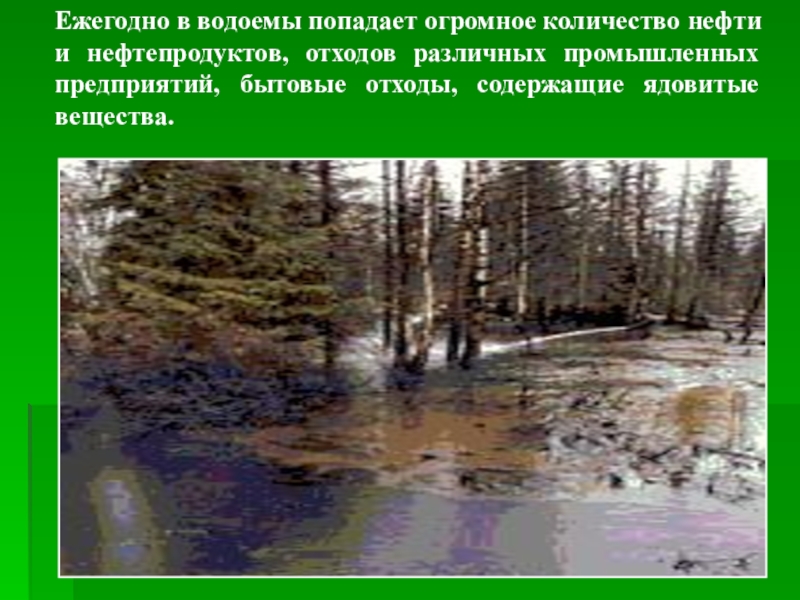 Слайд 5Ежегодно в водоемы попадает огромное количество нефти и нефтепродуктов, отходов различных