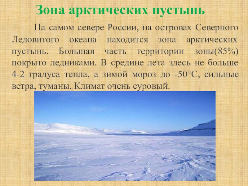 на островах Северного Ледовитого океана находится зона арктических пустынь. Большая часть территории зоны(85%) покрыто ледниками. В средине лета здесь не больше 4-2 градуса тепла, а зимой мороз до -50°С, сильные ветра, туманы. Климат очень суровый.