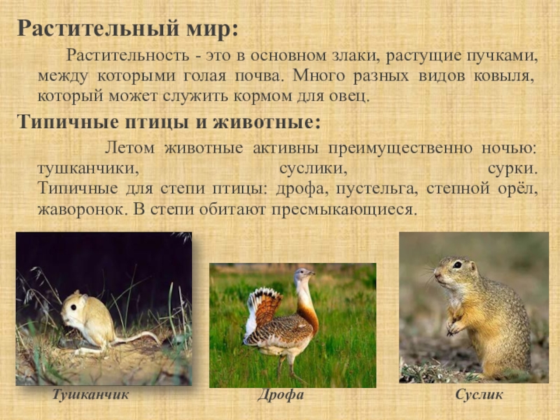 Типичные для степи птицы: дрофа, пустельга, степной орёл, жаворонок. В степи обитают пресмыкающиеся.