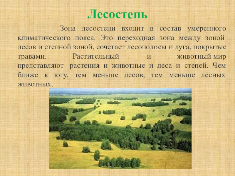 климатического пояса. Это переходная зона между зоной лесов и степной зоной, сочетает лесополосы и луга, покрытые травами. Растительный и животный мир представляют растения и животные и леса и степей. Чем ближе к югу, тем меньше лесов, тем меньше лесных животных.