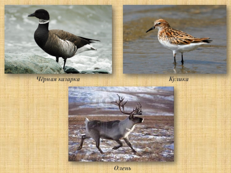 На болотах селятся утки, гуси, черные казарки и кулики. По тундре кочуют стада оленей в поисках ягеля – основного корма. Живут в тундре постоянно олени, белые куропатки, совы, вороны.