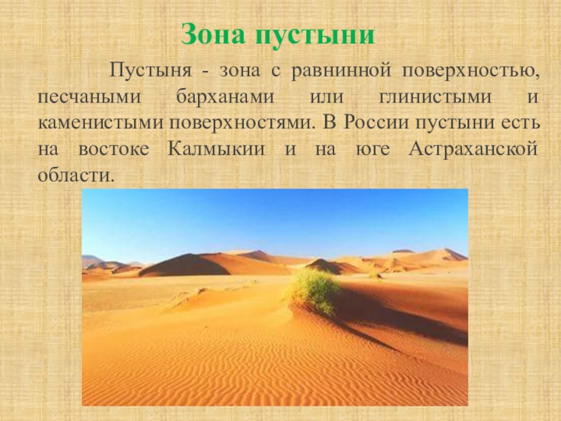 поверхностью, песчаными барханами или глинистыми и каменистыми поверхностями. В России пустыни есть на востоке Калмыкии и на юге Астраханской области.
