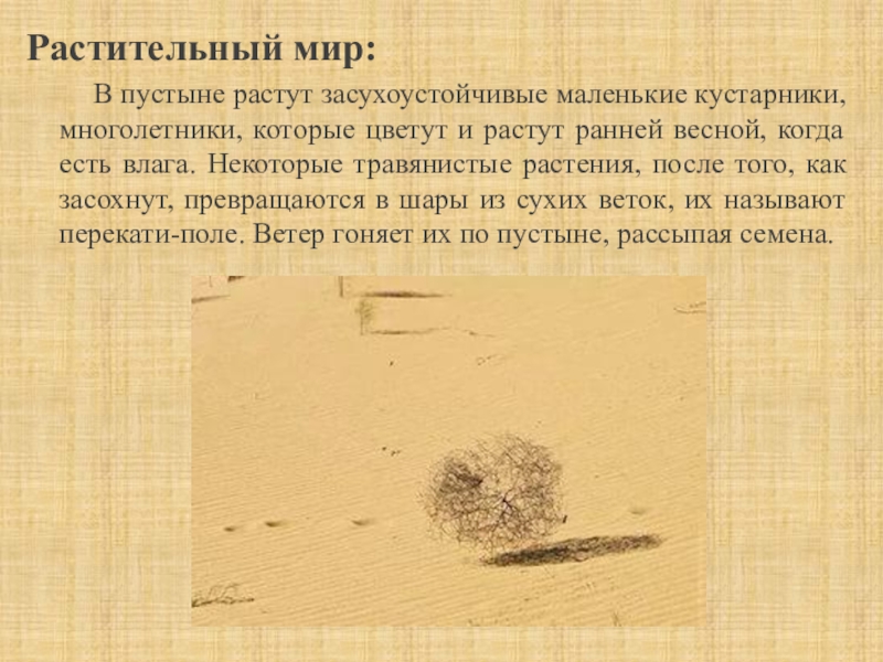 кустарники, многолетники, которые цветут и растут ранней весной, когда есть влага. Некоторые травянистые растения, после того, как засохнут, превращаются в шары из сухих веток, их называют перекати-поле. Ветер гоняет их по пустыне, рассыпая семена.