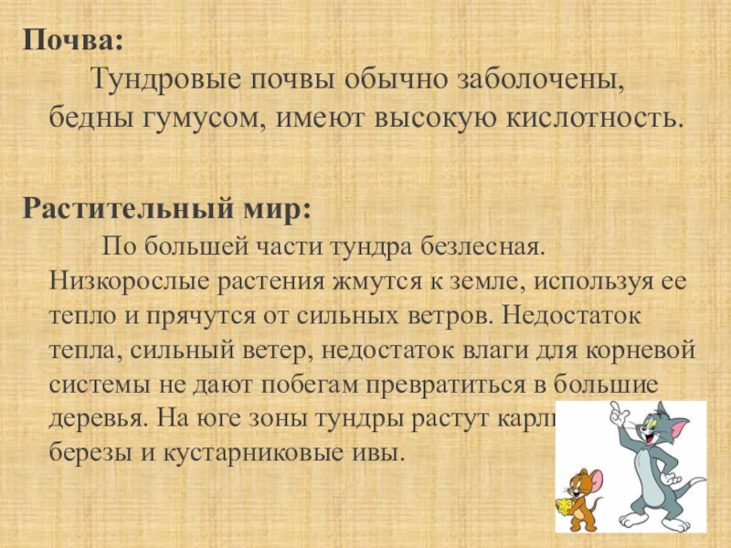 Тундровые почвы обычно заболочены, бедны гумусом, имеют высокую