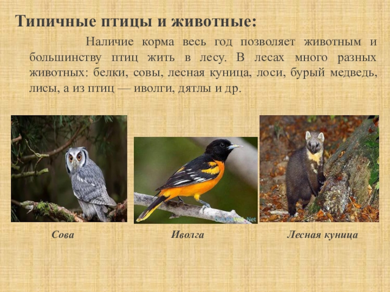 год позволяет животным и большинству птиц жить в лесу. В лесах много разных животных: белки, совы, лесная куница, лоси, бурый медведь, лисы, а из птиц — иволги, дятлы и др.