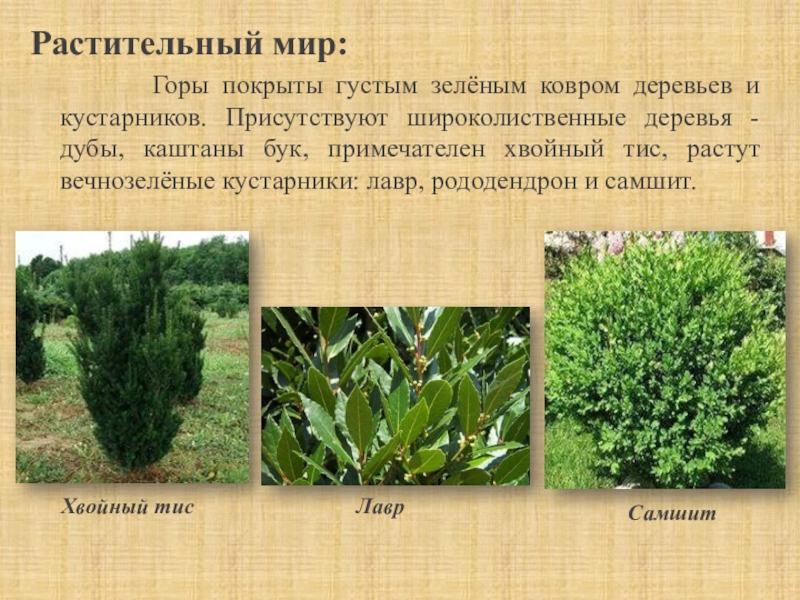 деревьев и кустарников. Присутствуют широколиственные деревья - дубы, каштаны бук, примечателен хвойный тис, растут вечнозелёные кустарники: лавр, рододендрон и самшит.