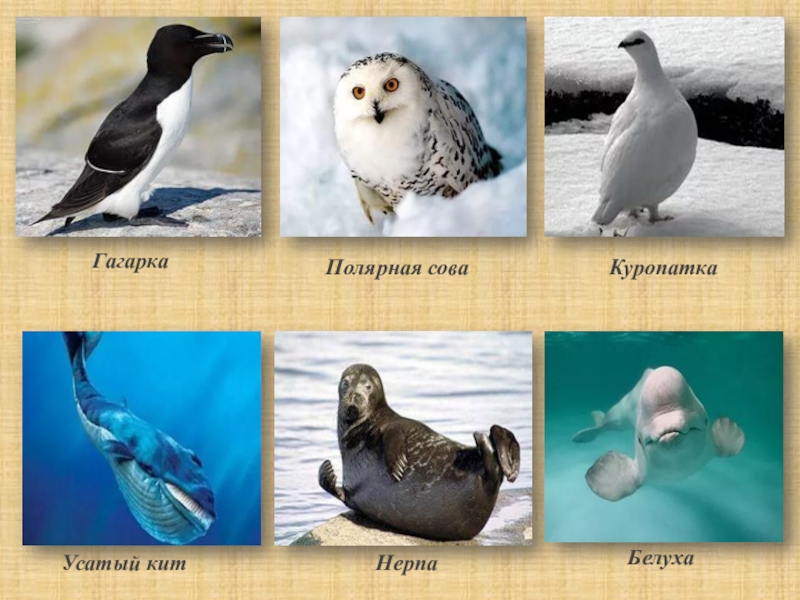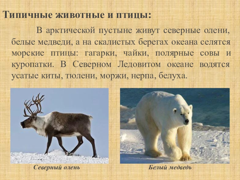 живут северные олени, белые медведи, а на скалистых берегах океана селятся морские птицы: гагарки, чайки, полярные совы и куропатки. В Северном Ледовитом океане водятся усатые киты, тюлени, моржи, нерпа, белуха.