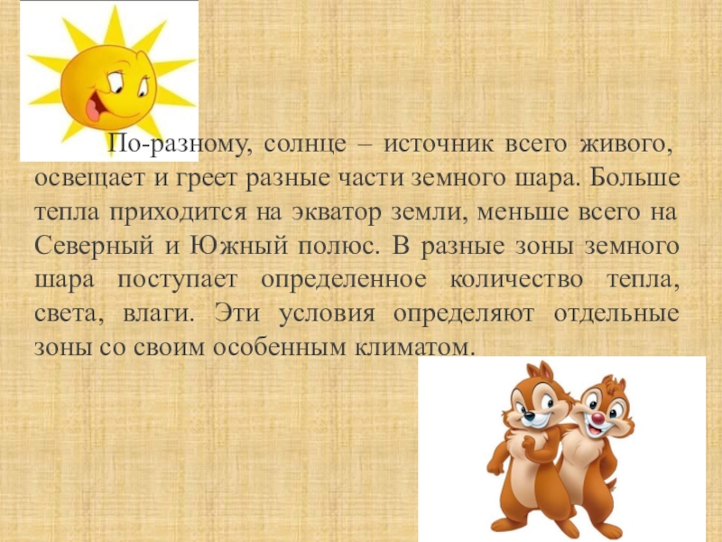и греет разные части земного шара. Больше тепла приходится на экватор земли, меньше всего на Северный и Южный полюс. В разные зоны земного шара поступает определенное количество тепла, света, влаги. Эти условия определяют отдельные зоны со своим особенным климатом.