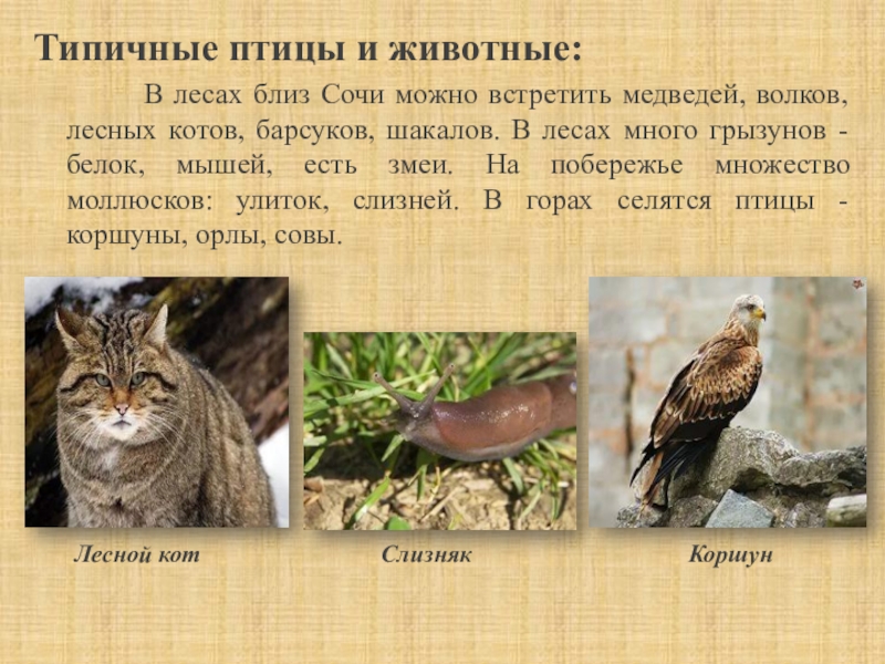 близ Сочи можно встретить медведей, волков, лесных котов, барсуков, шакалов. В лесах много грызунов - белок, мышей, есть змеи. На побережье множество моллюсков: улиток, слизней. В горах селятся птицы - коршуны, орлы, совы.