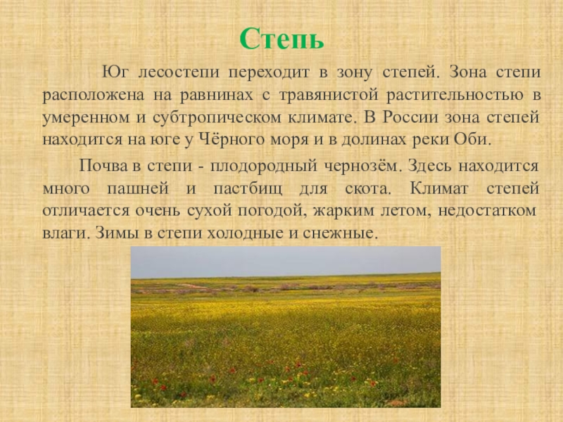 Почва в степи - плодородный чернозём. Здесь находится много пашней и пастбищ для скота. Климат степей отличается очень сухой погодой, жарким летом, недостатком влаги. Зимы в степи холодные и снежные.