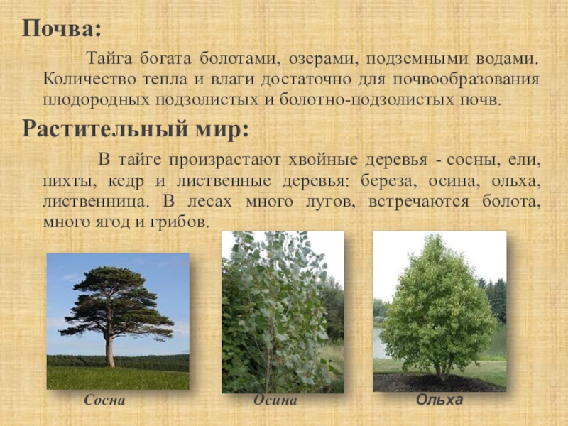 В тайге произрастают хвойные деревья - сосны, ели, пихты, кедр и лиственные деревья: береза, осина, ольха, лиственница. В лесах много лугов, встречаются болота, много ягод и грибов.