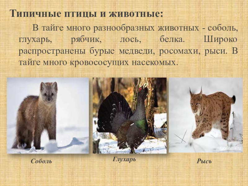 разнообразных животных - соболь, глухарь, рябчик, лось, белка. Широко распространены бурые медведи, росомахи, рыси. В тайге много кровососущих насекомых.