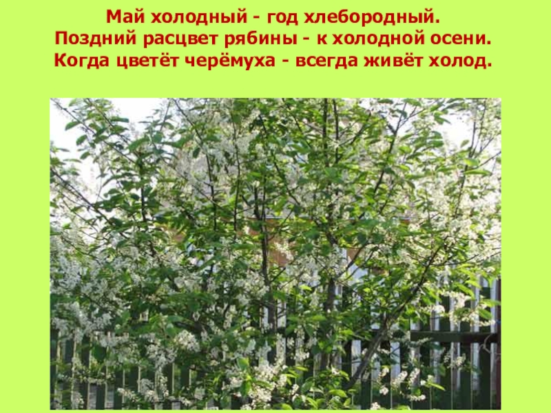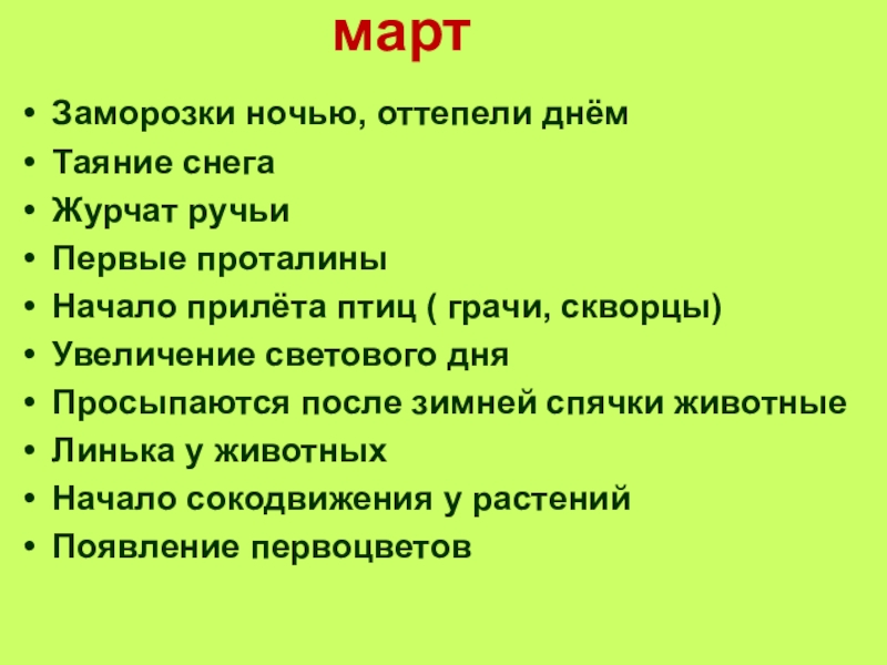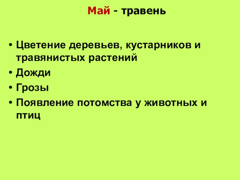 - Деревья покрываются листвой, на лугах густеют травы и расцвечиваются цветами, первое щёлканье соловья, первый гром.