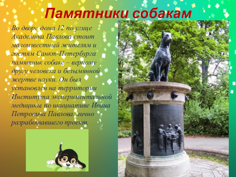 жителям и гостям Санкт-Петербурга памятник собаке – верному другу человека и безымянной жертве науки. Он был установлен на территории Института экспериментальной медицины по инициативе Ивана Петровича Павлова, лично разработавшего проект.