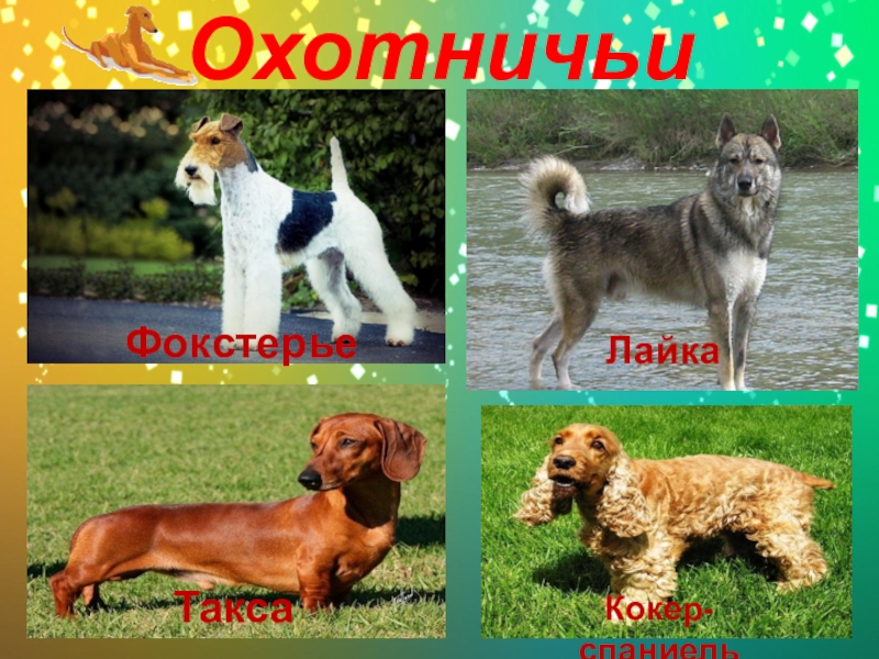 Охотничьи ФокстерьерТаксаЛайкаКокер-спаниель