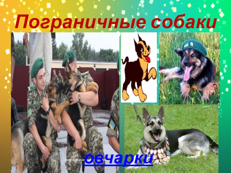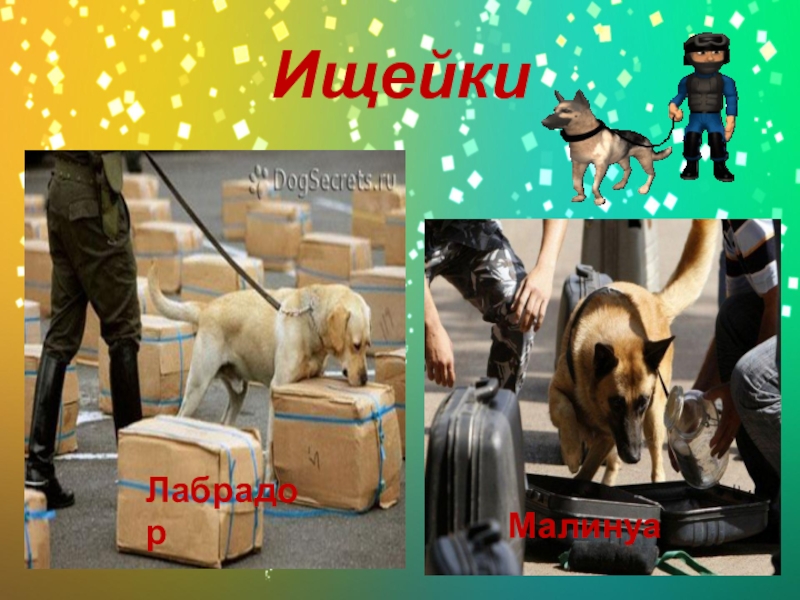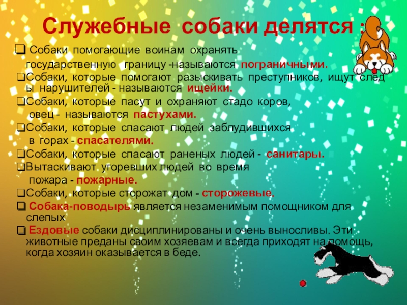 Служебные  собаки делятся : Собаки  помогающие  воинам  охранять  государственную   границу -называются  пограничными.Собаки,  которые  помогают  разыскивать  преступников,  ищут