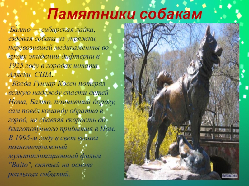 Памятники собакам. Ба́лто — сибирская лайка, ездовая собака из упряжки, перевозившей медикаменты во время эпидемии дифтерии в 1925