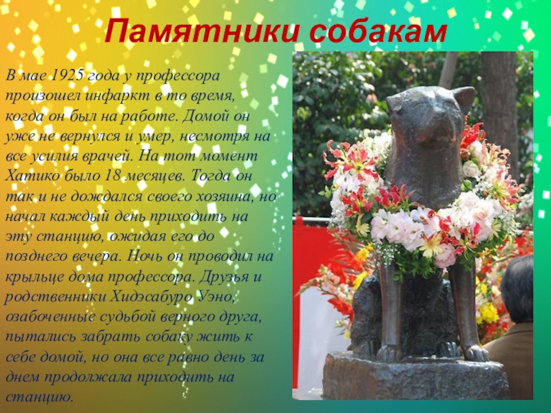 время, когда он был на работе. Домой он уже не вернулся и умер, несмотря на все усилия врачей. На тот момент Хатико было 18 месяцев. Тогда он так и не дождался своего хозяина, но начал каждый день приходить на эту станцию, ожидая его до позднего вечера. Ночь он проводил на крыльце дома профессора. Друзья и родственники Хидэсабуро Уэно, озабоченные судьбой верного друга, пытались забрать собаку жить к себе домой, но она все равно день за днем продолжала приходить на станцию.