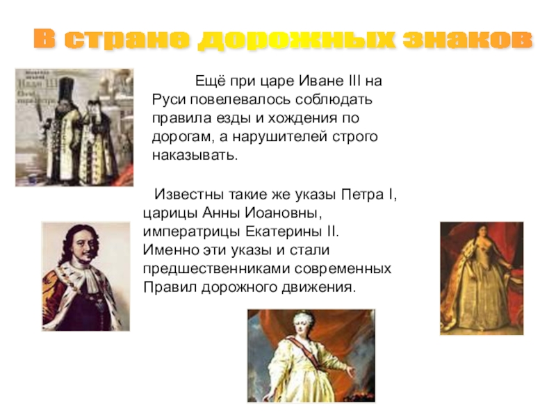 Известны такие же указы Петра I, царицы Анны Иоановны, императрицы Екатерины II. Именно эти указы и стали предшественниками современных Правил дорожного движения.